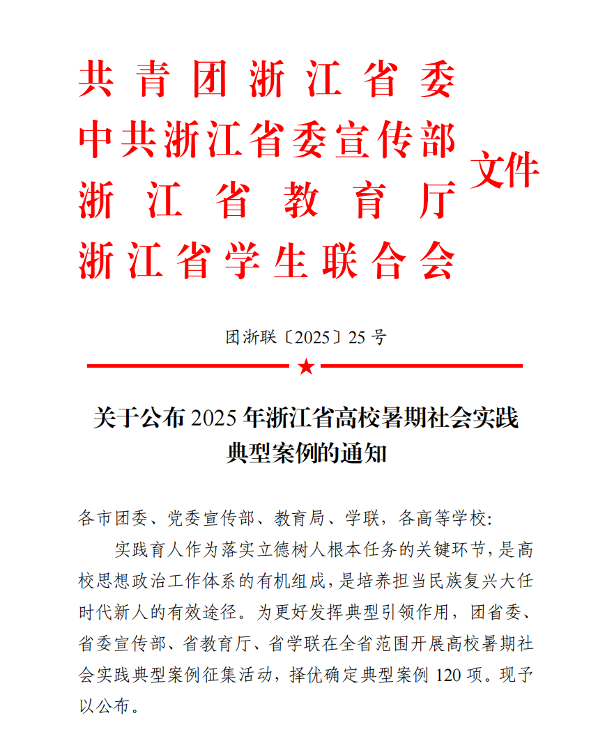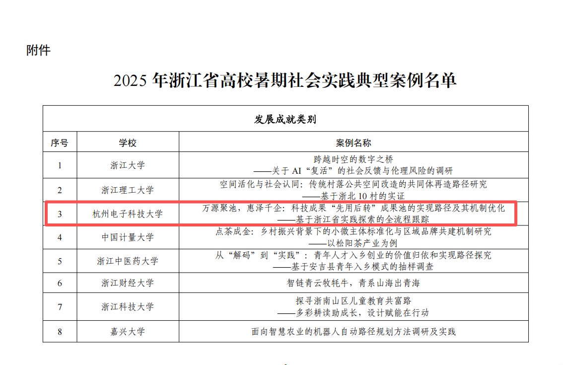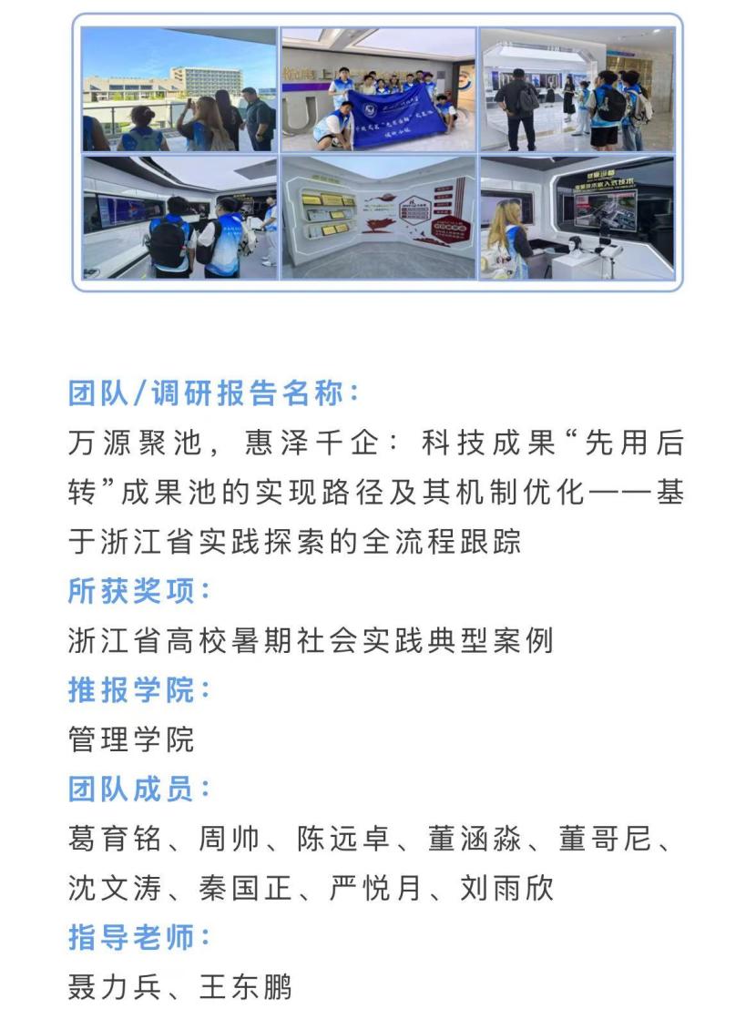2025年12月10日,共青团浙江省委、中共浙江省委宣传部、浙江省教育厅、浙江省学生联合会联合印发《关于公布2025年浙江省高校暑期社会实践典型案例的通知》,我院的《万源聚池,惠泽千企:科技成果“先用后转”成果池的实现路径及其机制优化——基于浙江省实践探索的全流程跟踪》项目获评“浙江省高校暑期社会实践典型案例”。该项目由小组成员葛育铭、周帅、陈远卓、董涵淼、董哥尼、沈文涛、严悦月、刘雨欣共同完成,由管理学院特聘副教授聂力兵与副教授王东鹏担任指导老师。